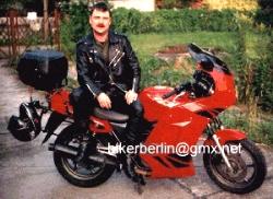 Gut 6 Jahre fuhr ich über ca. 100.000 Kilometer eine rote Honda CB 500, liebevoll "Möhre" genannt, die ich im Lauf der Zeit recht individuell zu einem praktischen Tourenmotorrad ausgebaut hatte: |