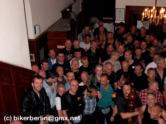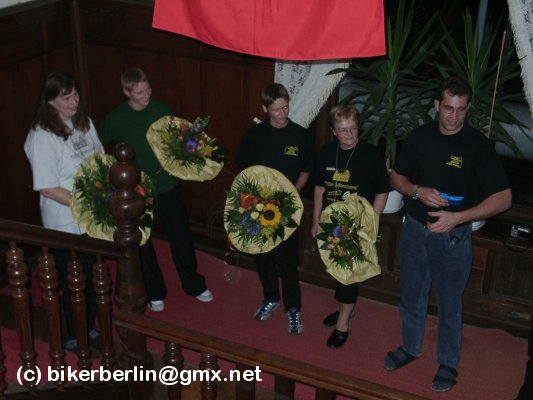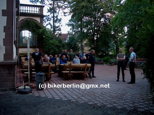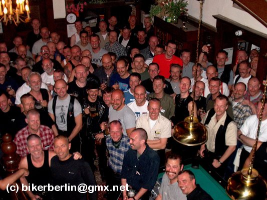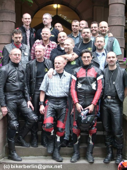 | Nach dem Abendessen dann leider schon der offizielle Abschied - vier geile und schöne Tage im Weserbergland mit lieben Freunden gehen langsam zu Ende, aber der Abschluss war richtig gut gemacht: Die 155 Kerle (und Kerlinnen :-) versammelten sich im Foyer der Villa, dann folgten die unvermeidlichen,aber lieben Reden und Ansprachen, ein herzliches Dankeschön an die wirklich tolle Crew der Villa Löwenherz und ein Ausblick auf ein Wiedersehen in 2002 - der nächste ECMC-Bikerun wird in Frankreich stattfinden, der Partnerclub MCRA aus Lyon lädt ein an die Ardeche in Südfrankreich !! | ![]() |